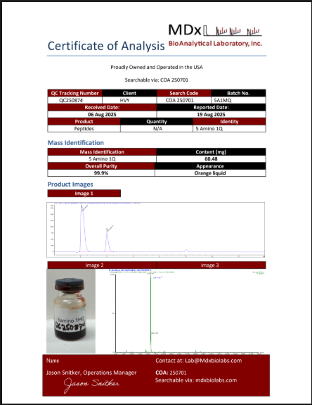 HVY Research ensures all batches are prepared in sterile, controlled facilities and undergo routine testing for identity and consistency. All research personnel must follow standard laboratory safety protocols.